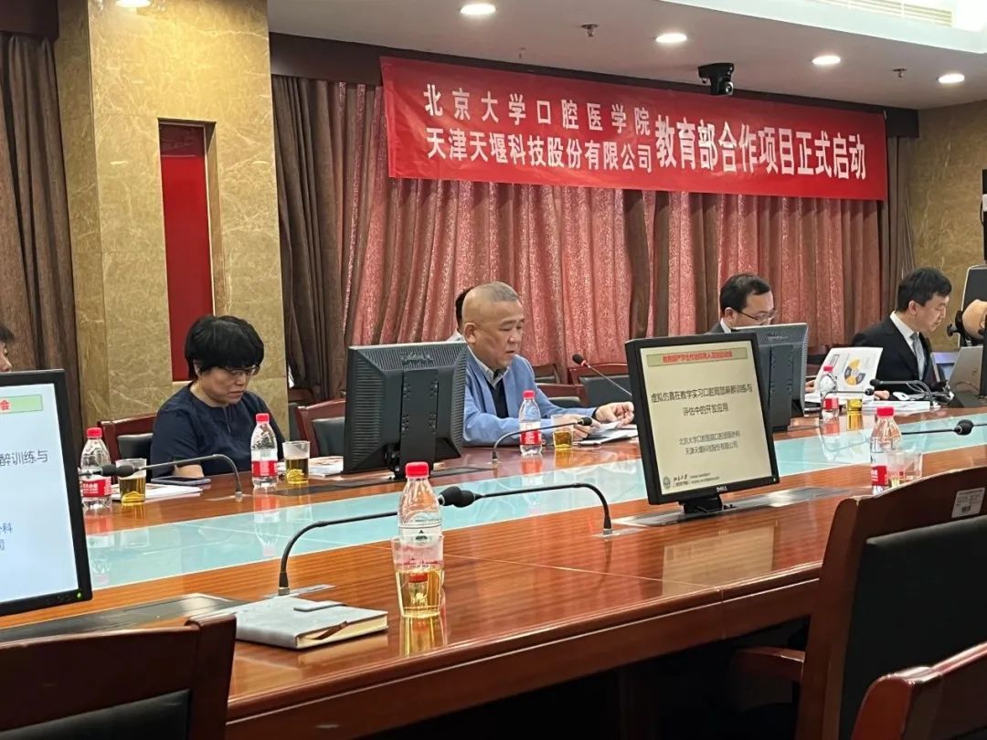 北大口腔副院长李铁军和天堰科技总经理刘雁飞分别发表讲话,强调了教学训练设备的重要性和口腔教学新品亟待开发的现状,双方表达了出对此次项目合作的期待和信心。